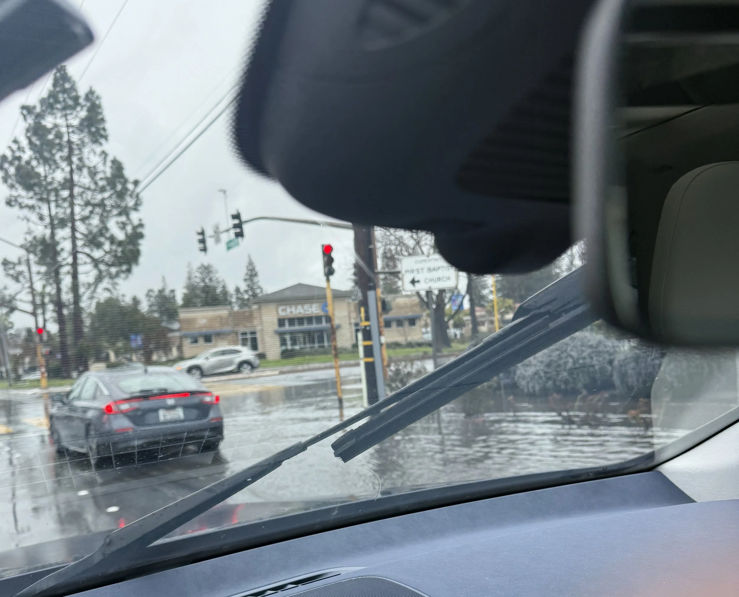Flooding on a local San Jose road during the recent February storms. Water pools across the intersection as cars navigate through the rain.